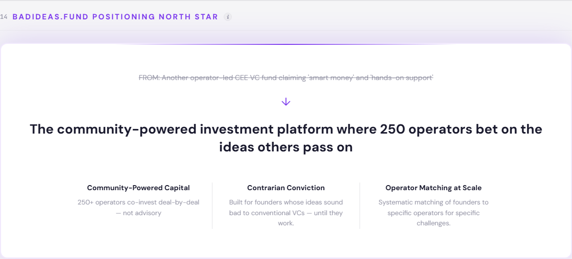 BADideas.fund has a structural asset that no competitor matches - 250 operators deploying capital deal-by-deal. The strategic failure would be describing that asset in the same language every other fund uses. The positioning work is not about finding a better adjective for “hands-on support.” It is about making the community the product, the contrarian thesis the filter, and the platform the category - before DEPO Ventures figures out the same playbook.