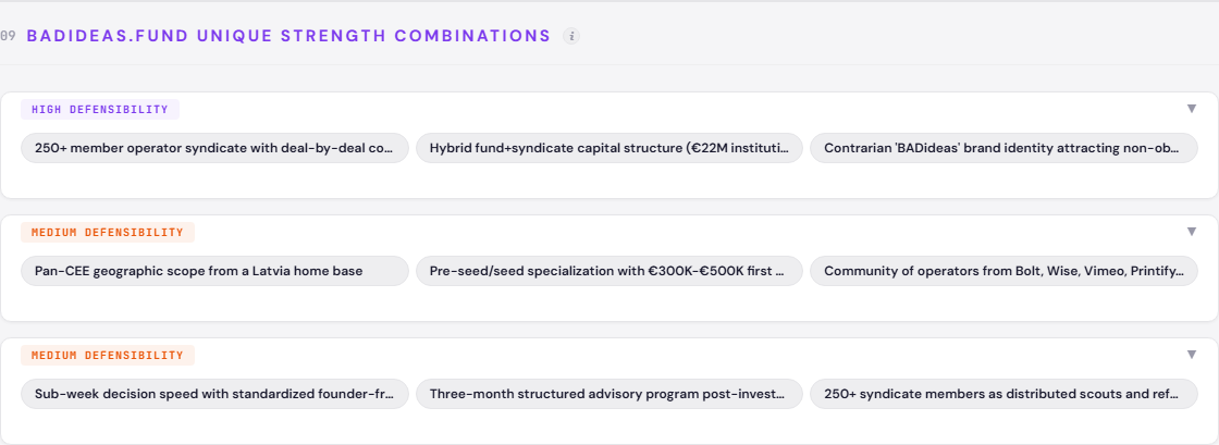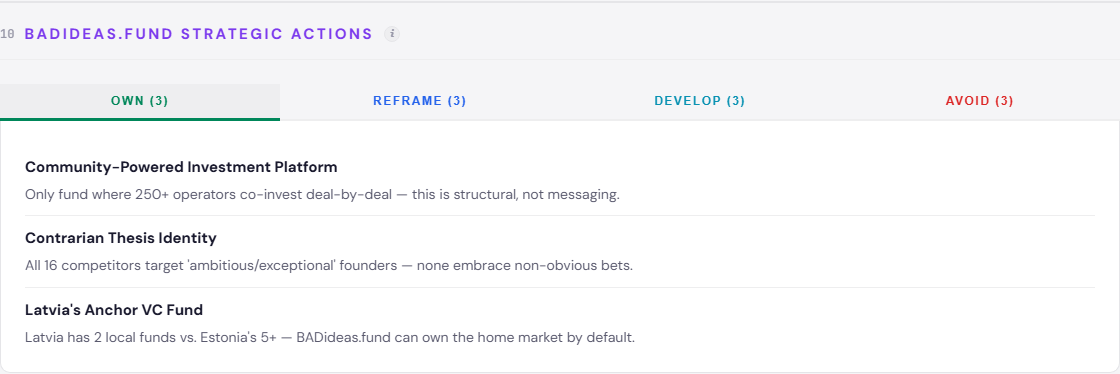 Three assumption gaps favor the fund. First, no competitor has claimed the “Community-Powered Investment Platform” territory - it sits unoccupied with HIGH client fit. Second, among the 16 analyzed, none have embraced a contrarian thesis identity. All target “ambitious” or “exceptional” founders. None embrace non-obvious bets. The BADideas brand name is already doing this work - it just needs strategic amplification. Third, among the 16 analyzed, only 2 are Latvia-based compared to 5-plus from Estonia. “Latvia’s Anchor VC Fund” is an unoccupied territory with HIGH client fit.
