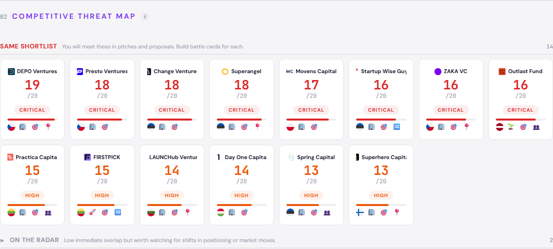 Half the analyzed landscape competes directly for the same positioning territory as BADideas.fund - targeting the same founders, communicating the same operator-led narrative, claiming the same hands-on support. DEPO Ventures is the closest structural mirror - it runs an identical hybrid fund-plus-syndicate model with a CEE focus and scores 19 on the positioning threat index, the highest in the landscape. Presto Ventures, Change Ventures, and Superangel all target the same buyer segment with overlapping operator-led claims. Movens Capital competes for the same CEE operator-led positioning with a EUR 60M fund advantage. The remaining 8 target adjacent buyers with overlapping claims but less direct positioning overlap. Every analyzed fund poses significant competitive pressure - none occupy a distant or unrelated positioning.