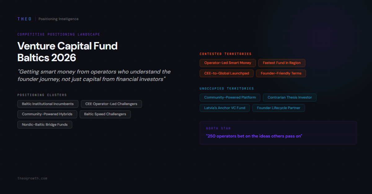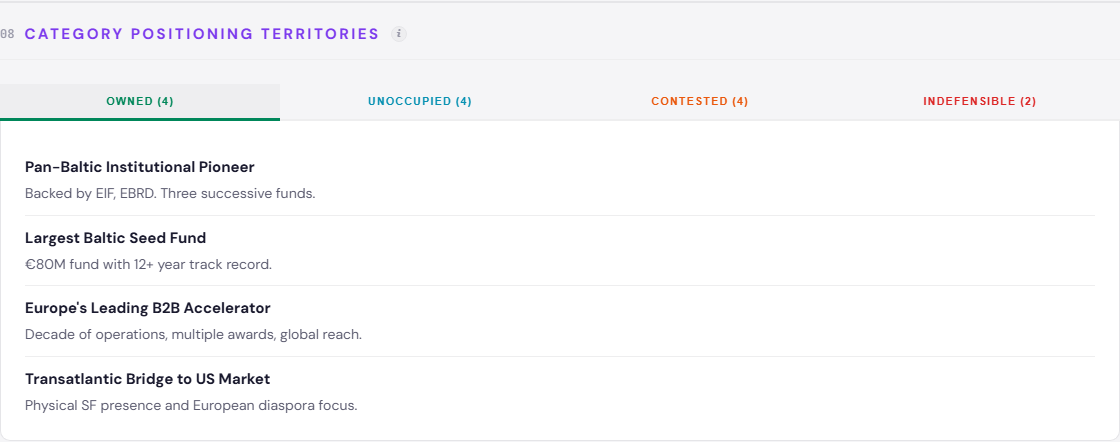 Own immediately: The Community-Powered Investment Platform territory is unoccupied and has HIGH client fit. No competitor has framed their syndicate this way. The Contrarian Thesis Identity - “backing founders others underestimate” instead of “backing ambitious CEE founders” - is equally open. Latvia’s Anchor VC Fund positioning fills a geographic gap that Estonia’s crowded fund landscape cannot contest.