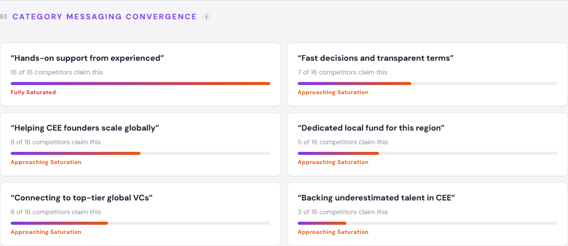 The convergence data tells the real story. “Hands-on support from experienced operators” - 16 of 16 analyzed competitors claim this. Full saturation. Not approaching it, not trending toward it. Every analyzed fund says the same thing. “Helping CEE founders scale globally” - 8 of 16. “Fast decisions and transparent terms” - 7 of 16. BADideas.fund overlaps with all three of these saturated zones.