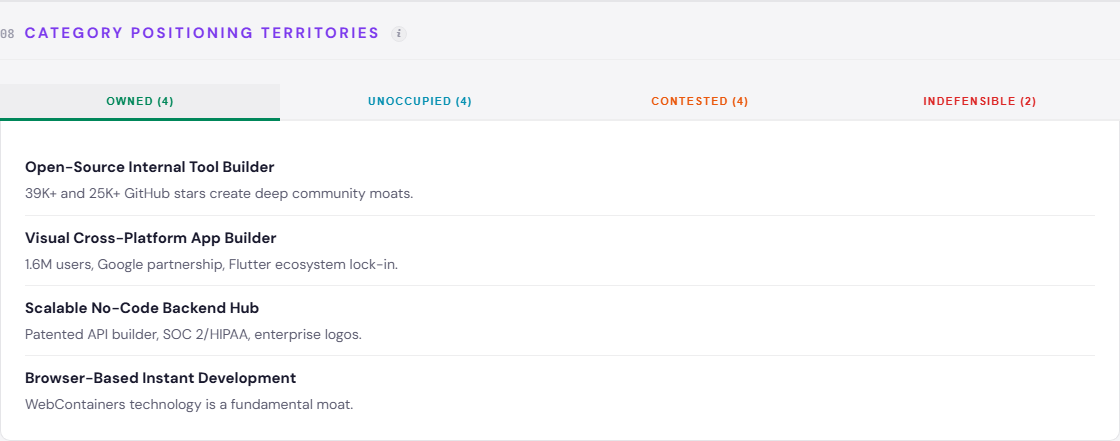 This is what the full interactive positioning landscape maps in detail - every competitor’s threat score, territory claims, and strategic rationale. Explore it here.