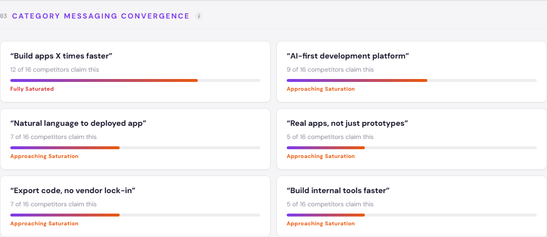 The convergence goes deeper than headlines. Seven of the 16 analyzed competitors claim code export and no vendor lock-in. Five insist their output produces “real apps, not just prototypes” - a defensive claim that reveals how little buyers trust AI-generated code. The entire category is arguing about speed and output quality while assuming those are the only dimensions that matter.
