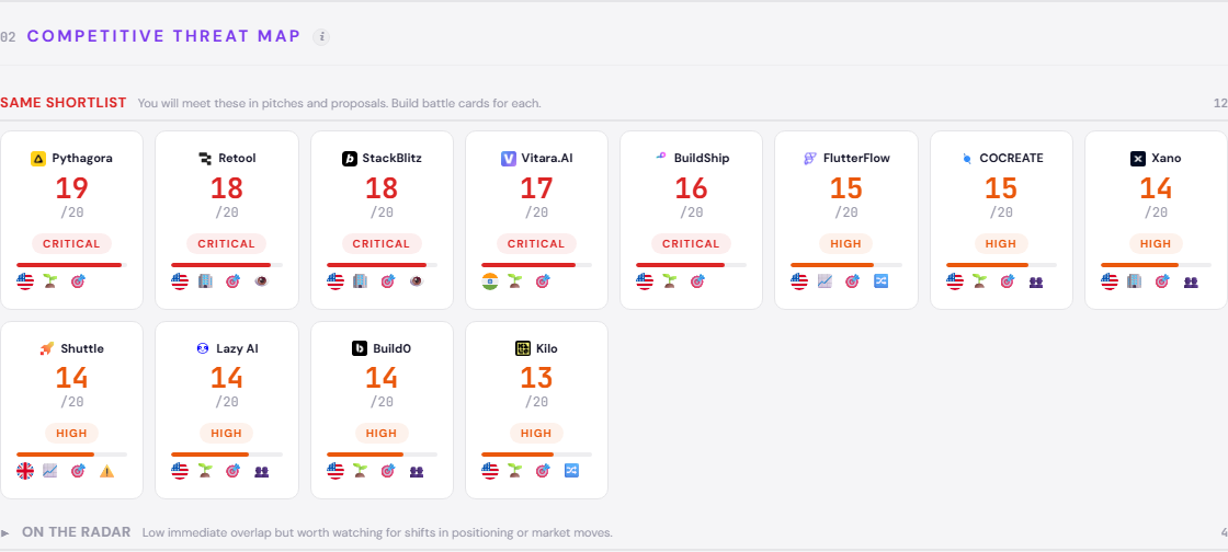 Pythagora sits at the top of the positioning threat index with a score of 19 - the closest structural mirror to Metatable. Same startup stage. Same “AI software engineer” narrative. Same collision course. Retool and StackBlitz both score 18, but they compete asymmetrically - massive user bases, established trust, different buyer segments. Vitara.AI at 17 and BuildShip at 16 round out the five platforms competing directly for the same positioning territory.