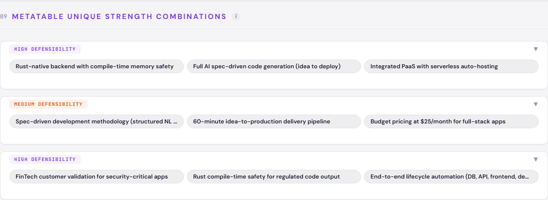 Metatable’s most defensible combination is specific: Rust-native backend generation, full AI spec-driven code generation, and integrated PaaS. No other analyzed platform combines these three. The second combination - spec-driven methodology, 60-minute delivery, and $25/month pricing - is defensible but less structurally unique. The third - FinTech validation, Rust compile-time safety, and end-to-end lifecycle automation - is where the real moat could form, if the validation is real.