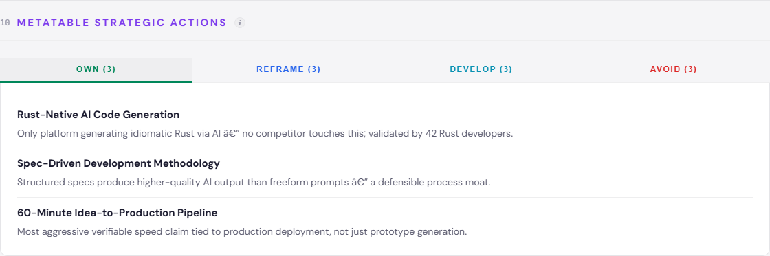 Twelve platforms promise speed. Seven promise code export. Five promise production-ready output. Not one has claimed the territory of proving that AI-generated code is actually good. The entire category assumes output quality is a feature, not a positioning territory. Metatable’s north star - moving from “another AI app builder” to “the production-grade AI development platform for Rust and regulated industries” - targets exactly this gap.