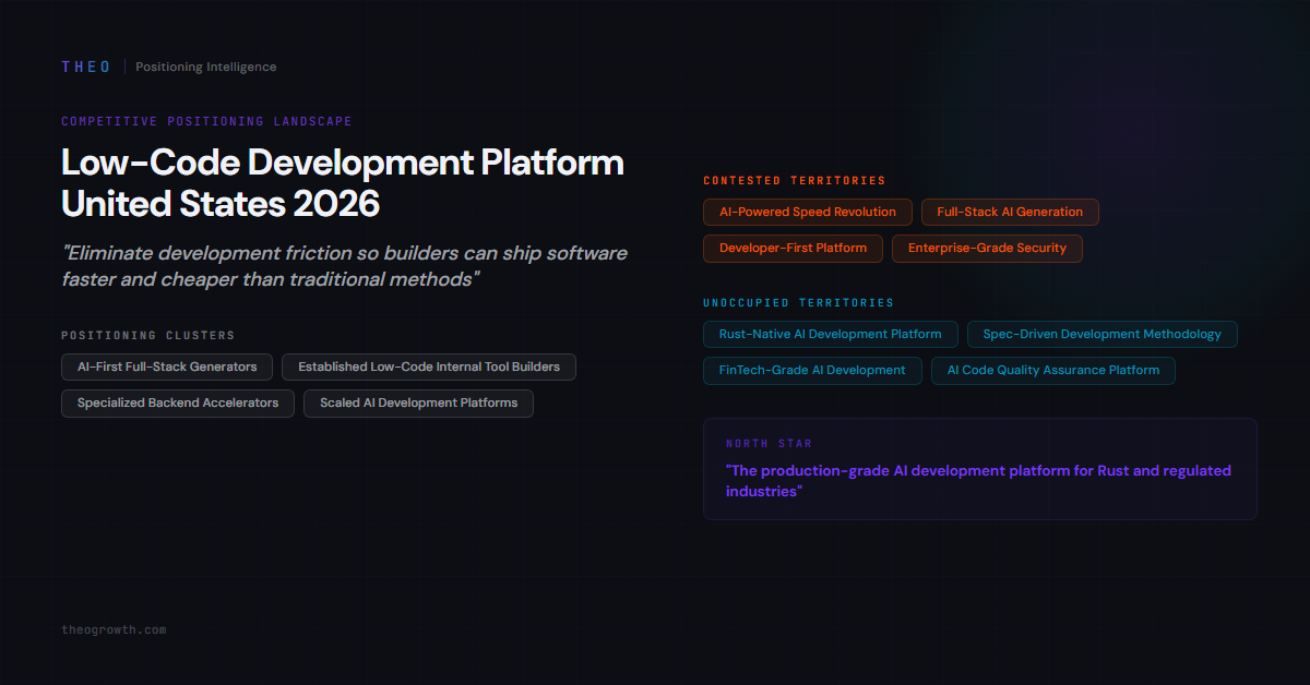 The low-code development platform category in the United States runs on a single thesis: eliminate friction so builders ship faster and cheaper. THEO’s discovery phase identified 112 competitors across this landscape. The 16 highest-priority were analyzed in depth - 5 competing directly for the same positioning territory, 11 targeting adjacent buyers with overlapping claims. The category is converging fast, and almost everyone is converging on the same point.