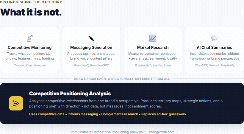 It is not competitive monitoring. Monitoring tracks what competitors do - pricing changes, feature launches, hiring patterns, press releases. This is valuable data collection, and some of these signals genuinely affect positioning. But tracking what a competitor launched is different from interpreting why they launched it, what territorial claim it represents, and how that changes the competitive dynamic for your brand. The same data serves both functions - the difference is the lens applied and the output produced.