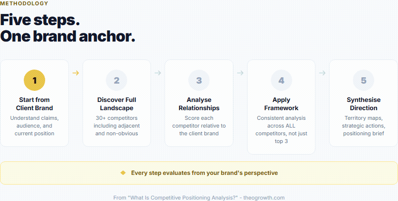 Whether done manually or assisted by software, competitive positioning analysis follows a recognisable sequence. Here is how the process works in practice.