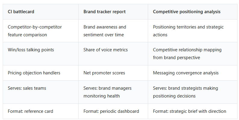 CI as a discipline is broad - encompassing both tactical monitoring and strategic analysis (Porter, SCIP). In practice, the dominant CI tools focus on sales enablement: battlecards, win/loss analysis, competitor alerts. Competitive positioning analysis asks a different question (“where can this brand win?”) and produces a different output (strategic direction vs. monitoring dashboards). The distinction is sharpest at the tooling level. For a detailed comparison, see CI vs. Positioning Strategy.