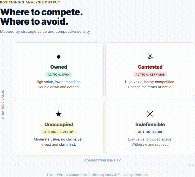 What to do: Identify which positioning territories are open, contested, or saturated. Decide where to compete. Draft a positioning direction that includes what you claim, who you claim it for, and why it is defensible.