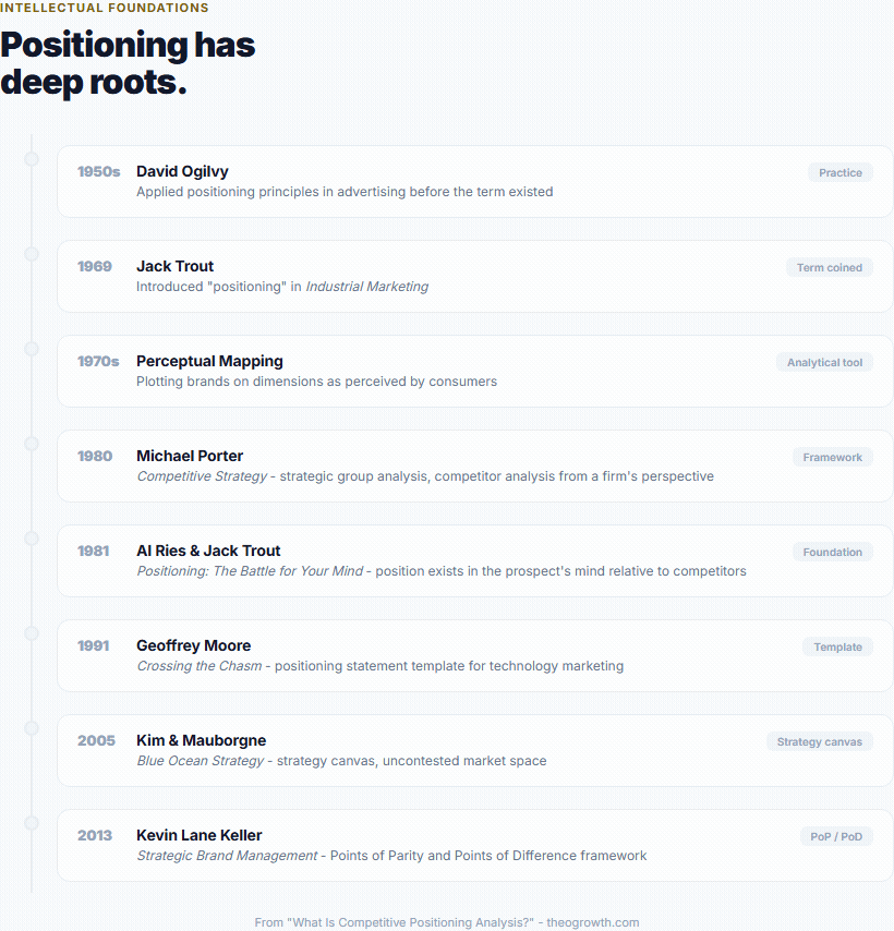 David Ogilvy applied positioning principles in advertising from the 1950s. Jack Trout introduced the term to marketing literature in a 1969 article in Industrial Marketing, and together with Al Ries published the landmark Positioning: The Battle for Your Mind in 1981. Their core argument - that