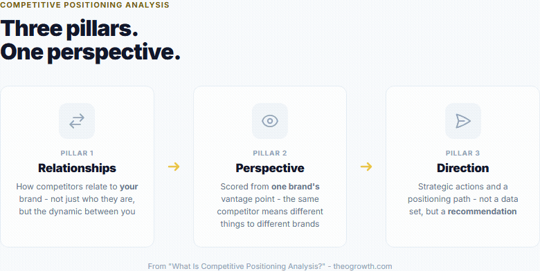 Perspective because the same competitor can be a direct threat to Brand A and irrelevant to Brand B, even within the same industry. Positioning analysis starts from one brand’s vantage point and assesses every competitive relationship relative to that brand’s specific position, audience, and claims.