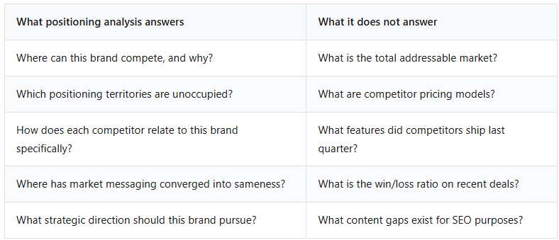 It is not market research. Survey-based brand research (Kantar, Ipsos) measures how consumers currently perceive a brand. This is retrospective and audience-facing. Positioning analysis is forward-looking and competitor-facing: where should the brand move, given the competitive terrain?