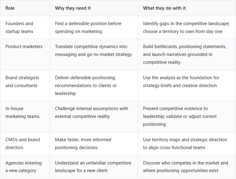 The common thread: anyone whose job involves deciding where a brand should stand relative to competitors - whether that brand is a Fortune 500 company or a startup with a team of five.